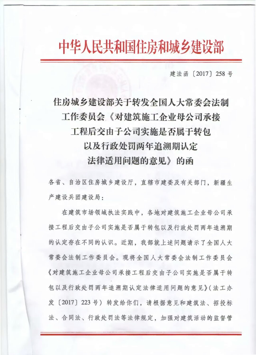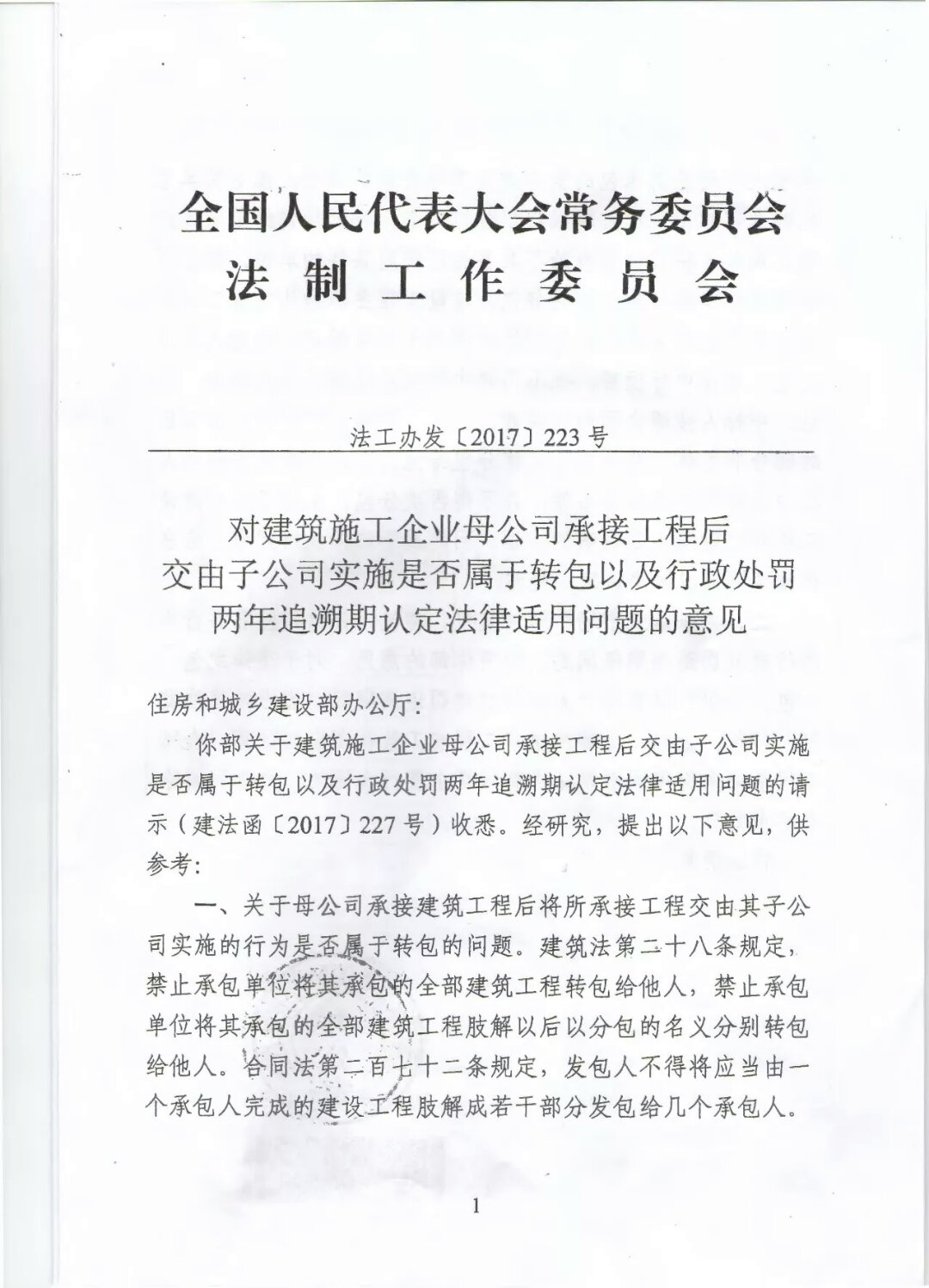 近日,住房與城鄉建設部向全國人大常委會法制工作委員會(下稱“全國人大法工委”)發出請示函,全國人大法工委作出《對建筑施工企業母公司承接工程后交由子公司實施是否屬于轉包以及行政處罰兩年追溯期認定法律適用問題的意見》(法工辦發[2017]223號,以下簡稱《意見》),其第一點認為: