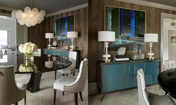 這是一美式住宅軟裝設計案例。案例中設計師于客廳、臥室以蒂芙尼藍的色彩詮釋這一對新人對居住空間幸福和浪漫的追求,鉚釘收邊的沙發椅、透明的水晶燈、古典優雅的壁爐與及各個空間充滿藝術氣息的裝飾畫搭配設計無不給人溫馨、舒適、優雅的空間體驗和享受。
